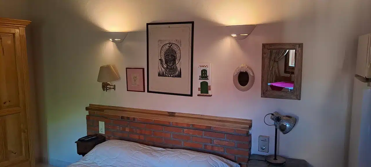 Die Honeymoon-Suite ist das gemütlichste Zimmer des Hotels und zugleich eines der elegantesten. Ihre intime Atmosphäre macht sie zum idealen Ort, um einen romantischen Aufenthalt zu zweit zu genießen, in einem sorgfältig gestalteten Bereich von 20 m². Sie befindet sich im ersten Stock, direkt über dem Grillbereich, und bietet einen wunderschönen Blick auf den Garten, der zum Entspannen und Abschalten einlädt.