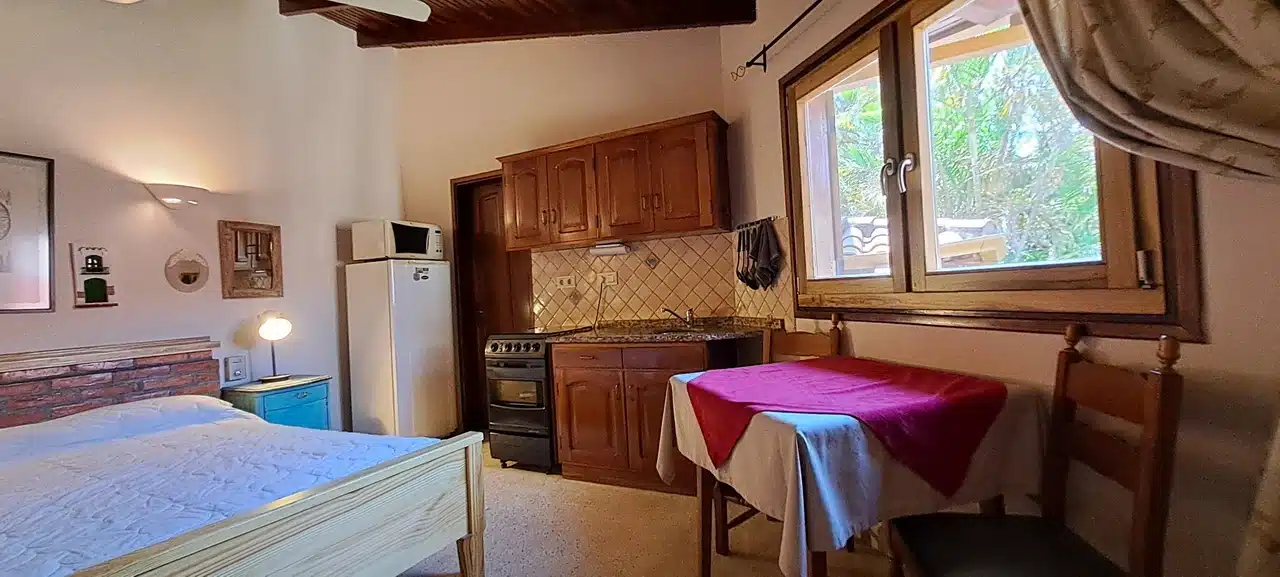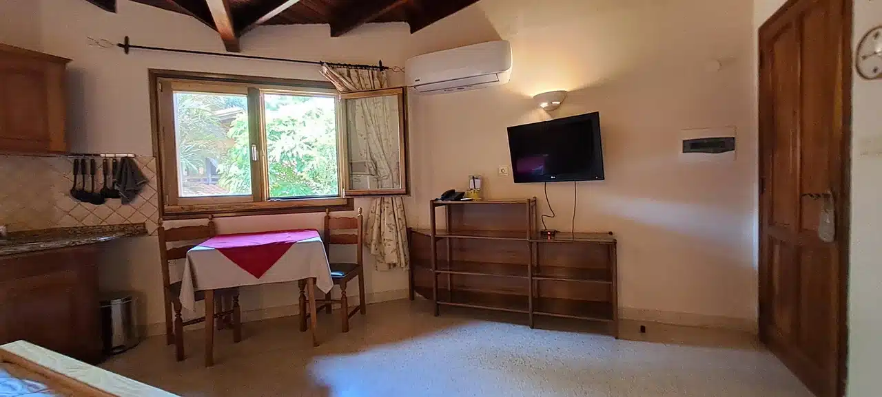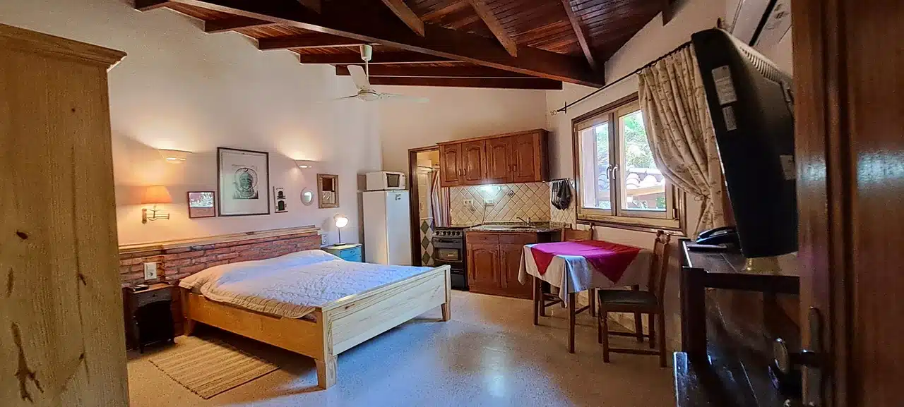 Mit 35 m² vereint Apartment 8 auf perfekte Weise Funktionalität und künstlerischen Stil. Die großzügige Wohnküche ist mit Kühlschrank, Herd und allem Notwendigen ausgestattet, um Mahlzeiten bequem zuzubereiten. Sowohl die Klimaanlage als auch der Ventilator sorgen zu jeder Tageszeit für eine frische und angenehme Atmosphäre.